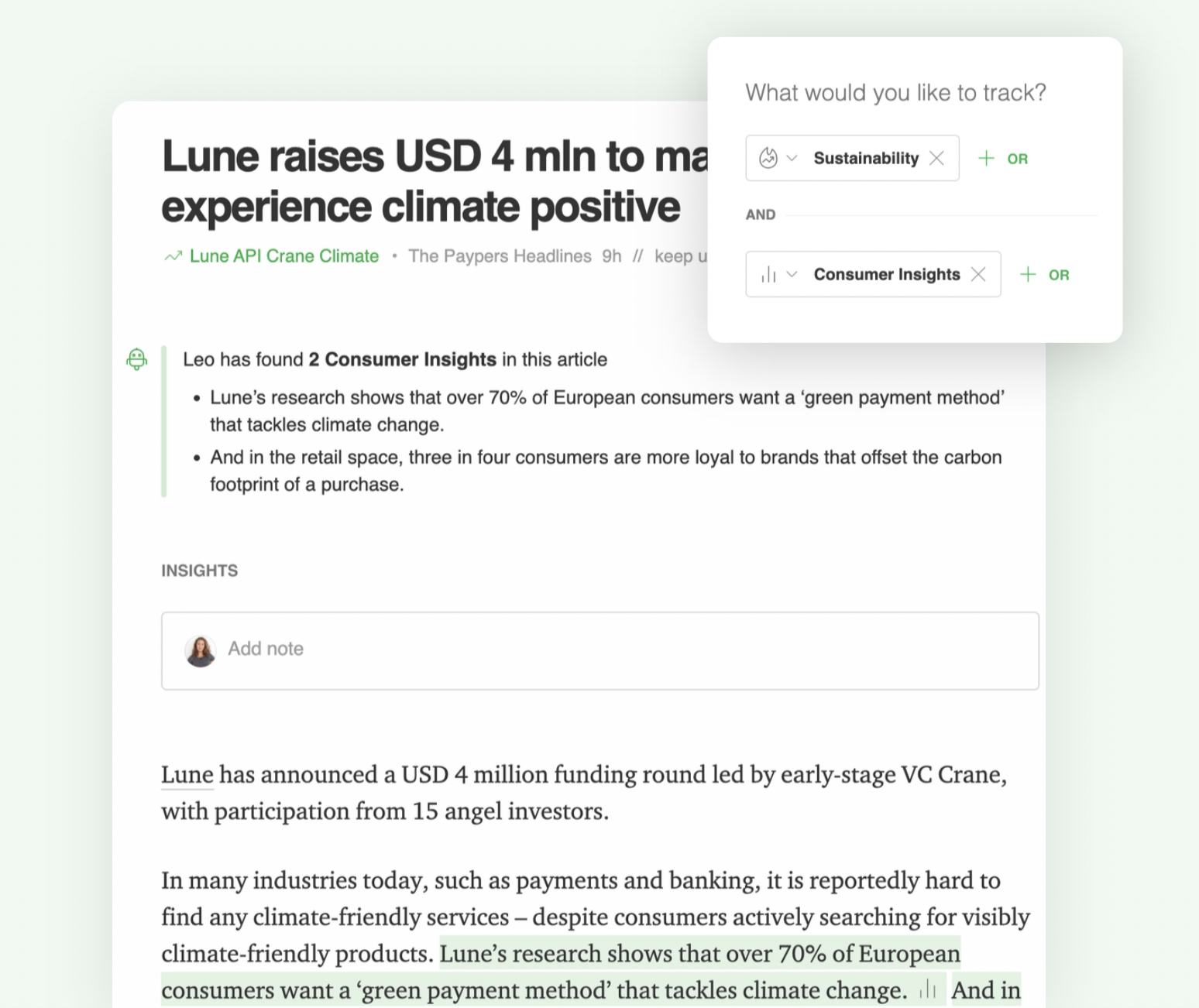 Manually tracking consumer behaviors often feels like searching for a needle in a haystack. That’s why we built the Consumer Insights Leo Concept, which surfaces articles that mention behavioral statistics and consumer data most relevant to you.
