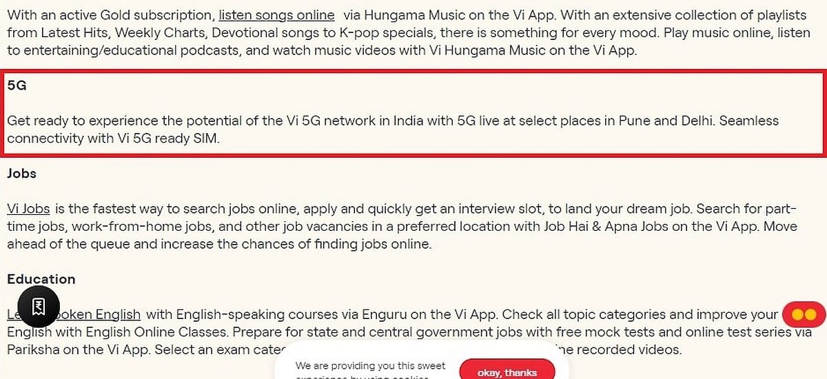 The telecom operator’s website was recently updated to suggest the imminent arrival of 5G connectivity in the country. “Get ready to experience the potential of the Vi 5G network in India with 5G live at select places in Pune and Delhi, the website states. There’s no word from the operator on when and where 5G connectivity will be available in these cities.