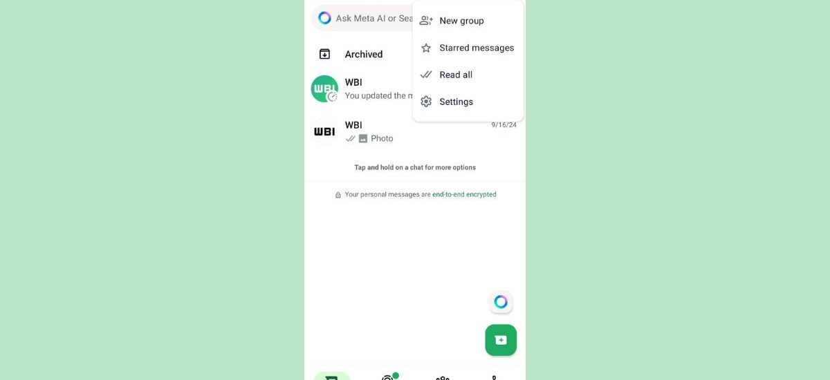 The Read all option in the overflow menu can be accessed by tapping the three dot menu. Tapping Read all marks all chats in the list as read, negating the need to manually select all chats and choosing the Mark as read option.
