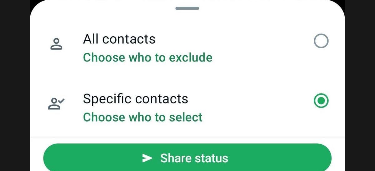The screenshot shows that users now have two options while sharing status updates: All contacts and Specific contacts. The former option also lets them exclude certain contacts from viewing status updates, without having to change settings individually. The feature tracker speculates this move may offer users more control over the privacy around status updates.