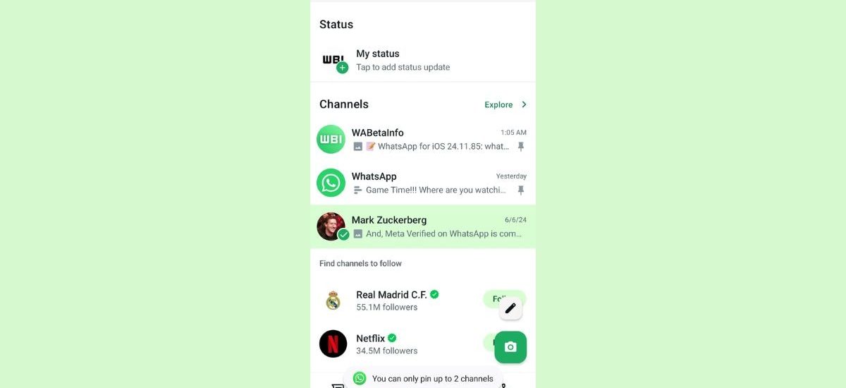 According to a claim by feature tracker WABetaInfo, the Meta-owned instant messaging service is rolling out the ability to pin up to two channels with WhatsApp beta for Android 2.24.13.3. Once the functionality is enabled, users can touch and hold on to up two channels in the list, then tap the pin icon from the top bar, as visible in the screenshot leaked by WABetaInfo.