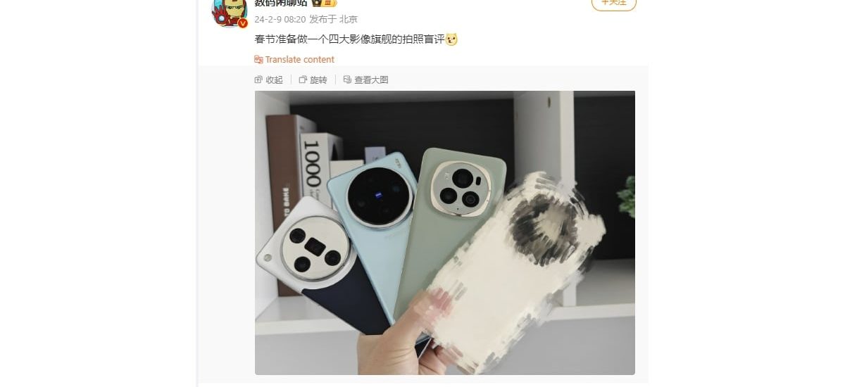 Alleged live image of Xiaomi 14 Ultra arrives courtesy of tipster Digital Chat Station (translated from Chinese) through Weibo. The handset appears to sit alongside a few flagship phones from other brands. The picture offers a vague view of the device in an off-white colourway with a circular-shaped camera module, resembling the design language of last year’s Xiaomi 13 Ultra.